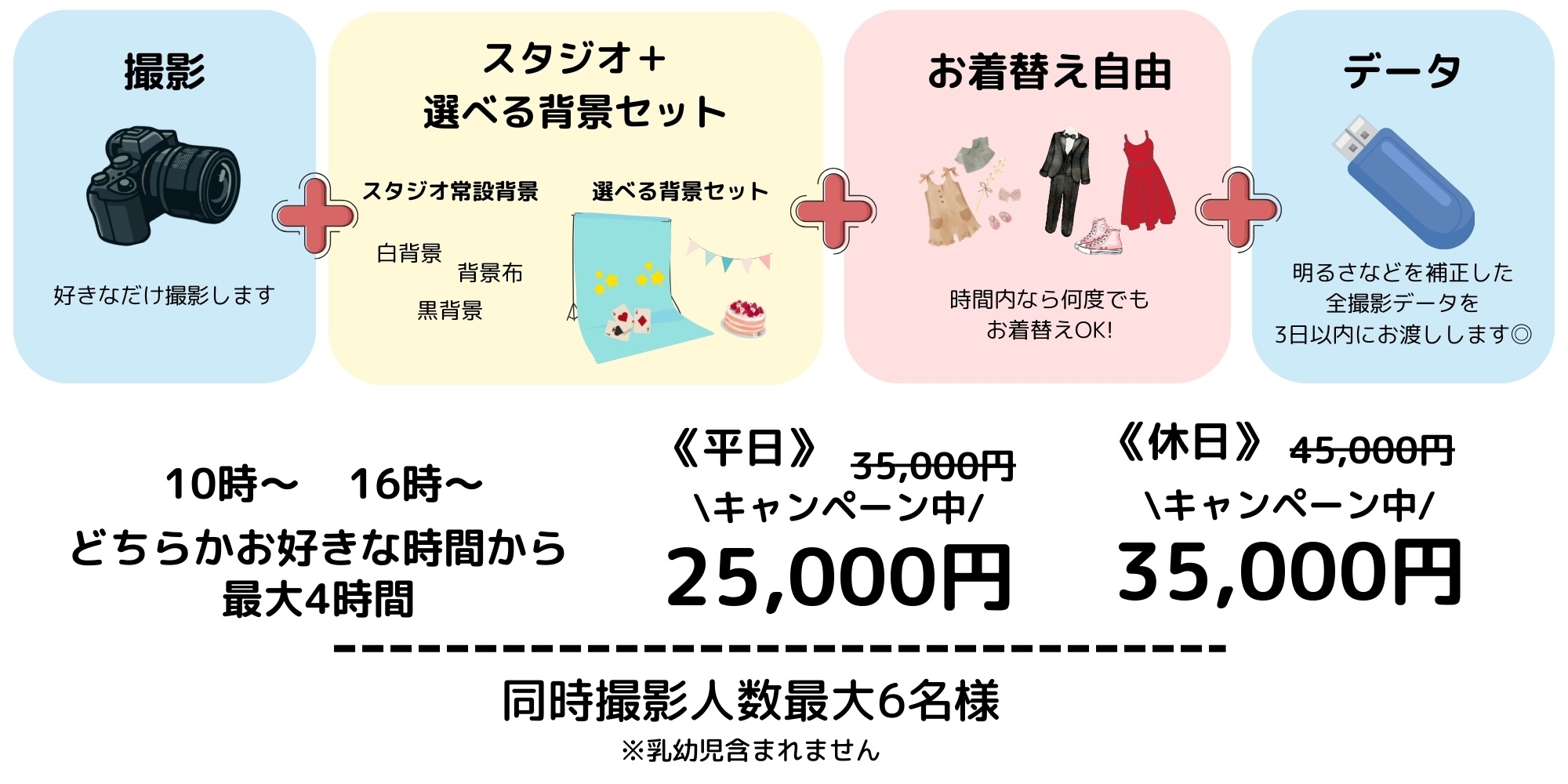 キッズ、ファミリー、お誕生日、七五三、成人、卒業、入学、100日記念、マタニティなど