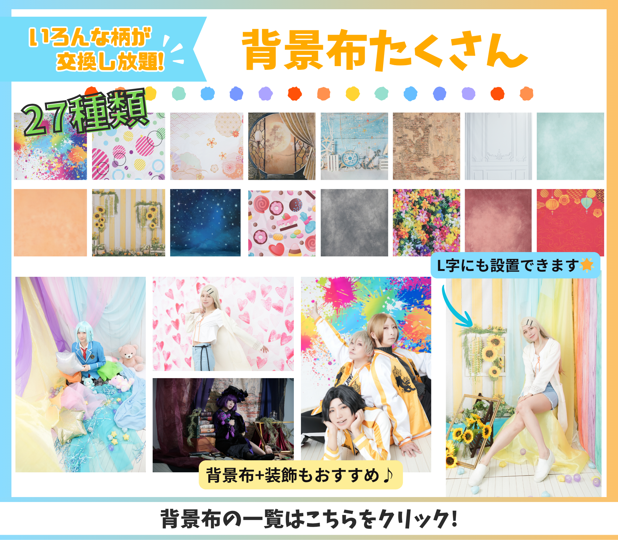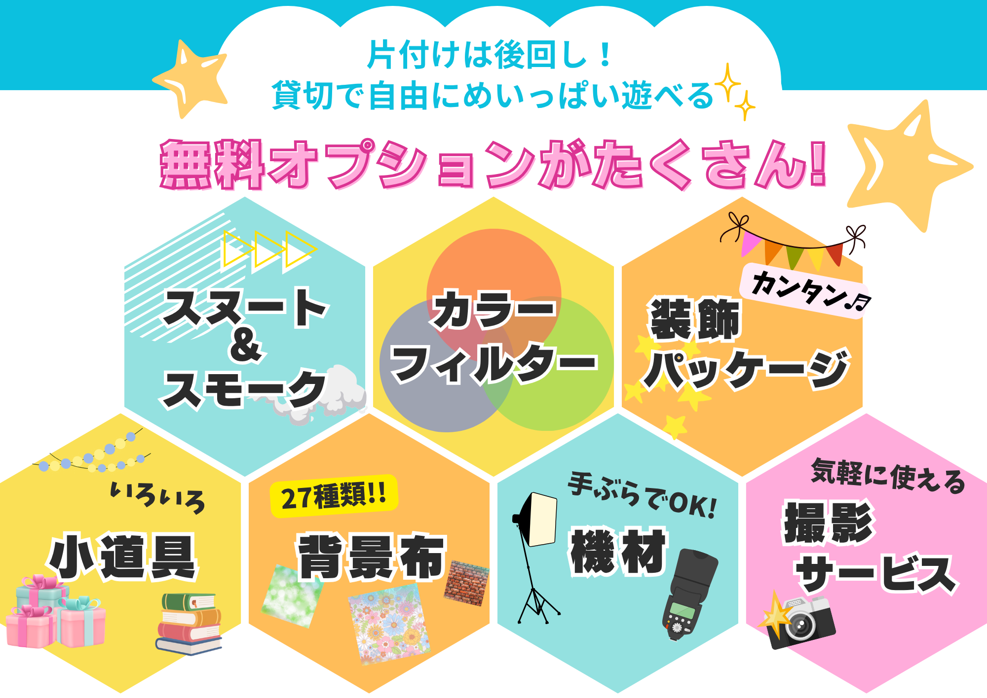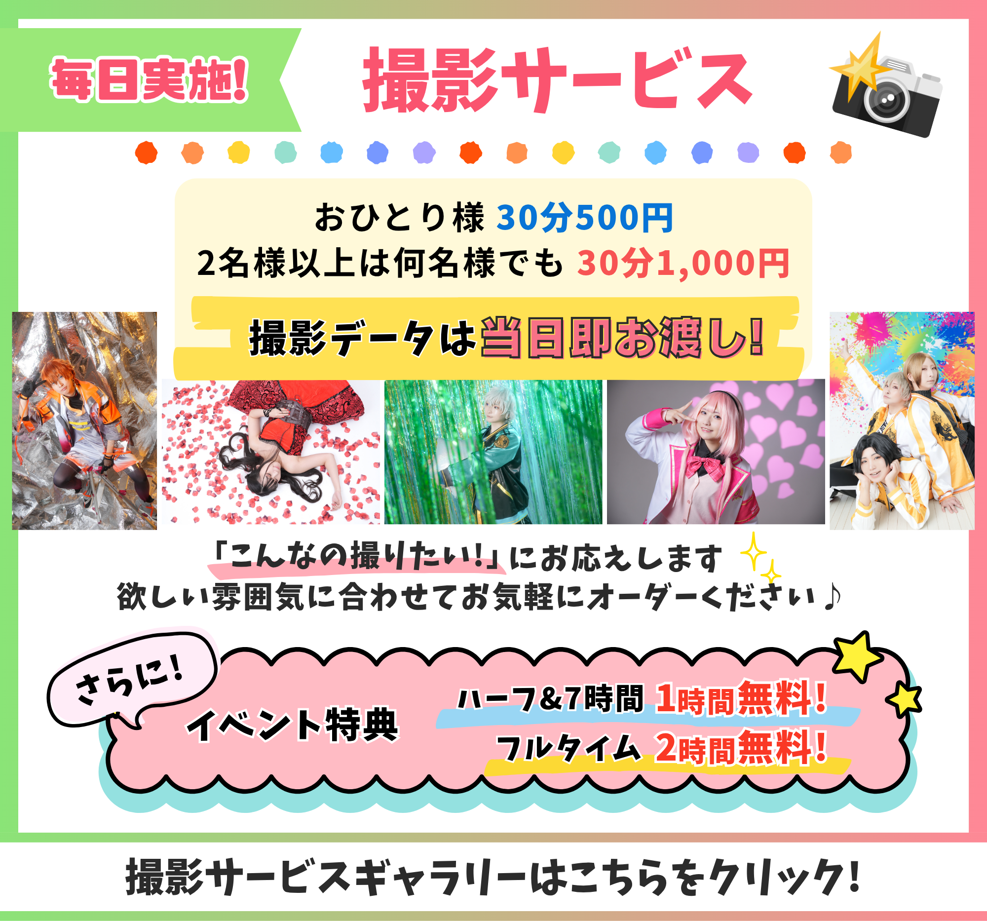 撮影サービス:有(⚫︎時間程度)・無