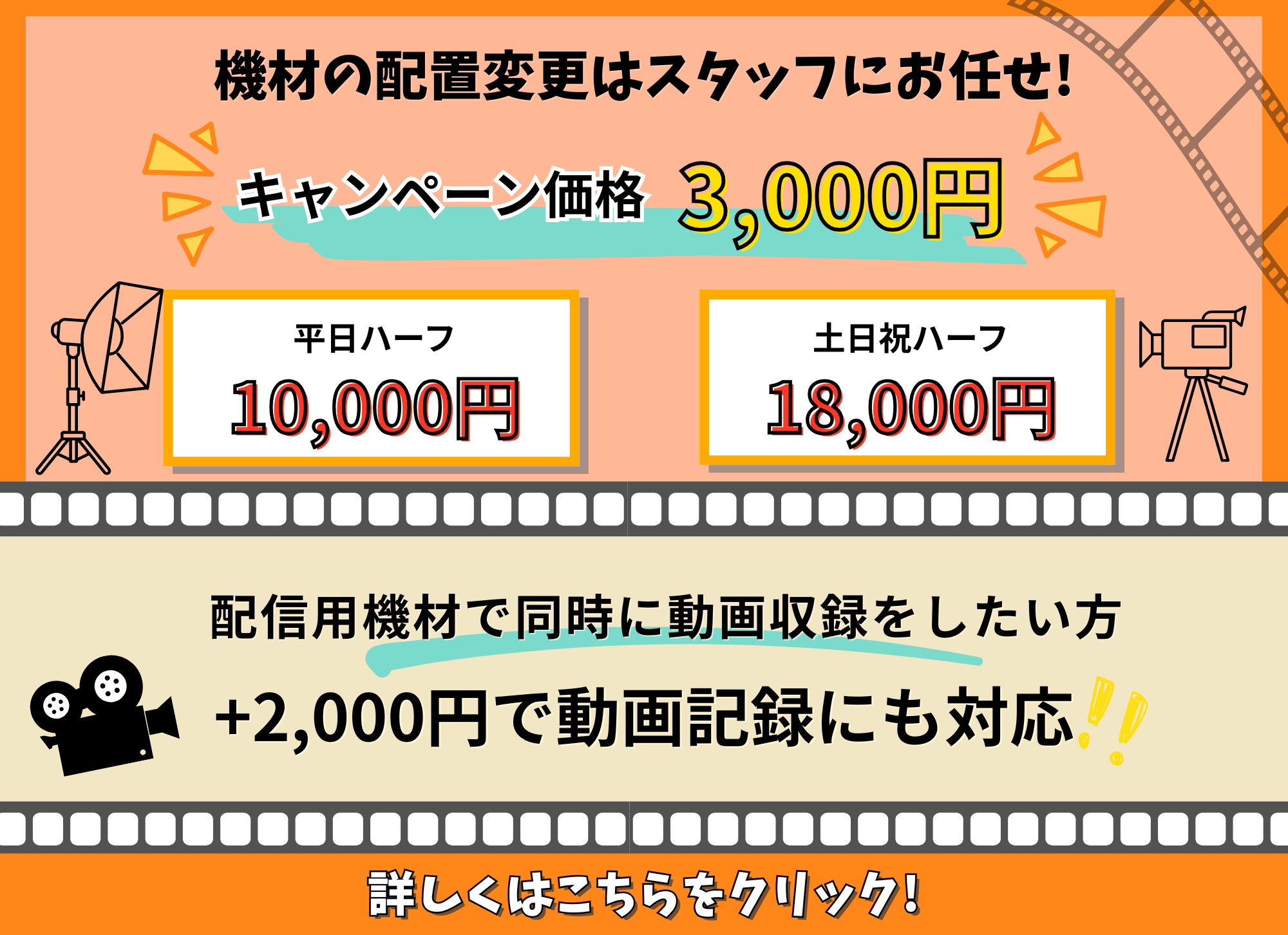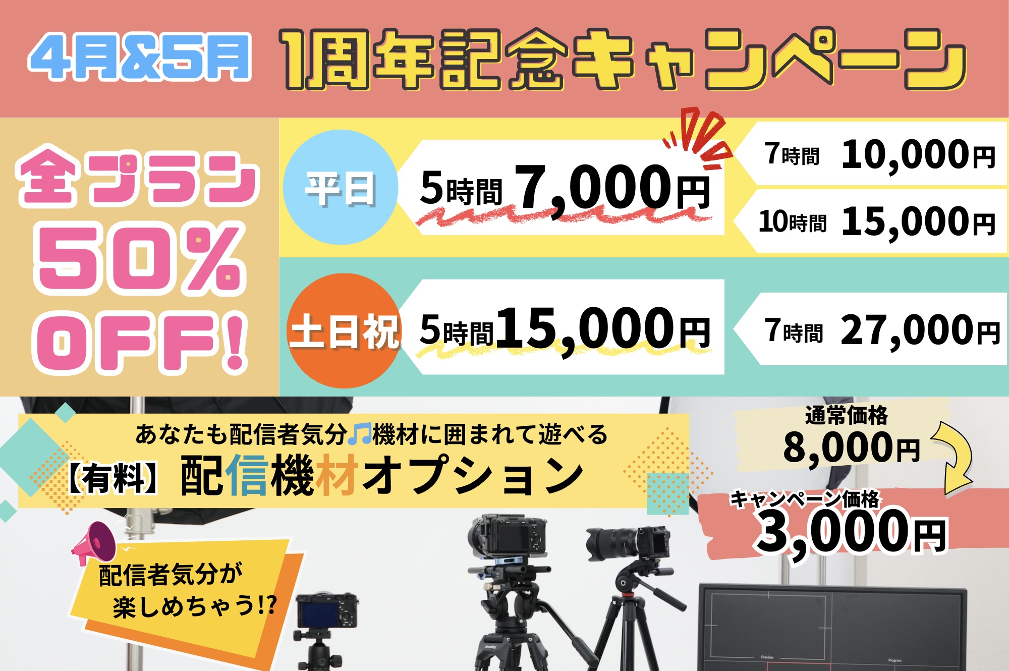 配信機材オプション+動画撮影:有・無(3日前までの事前予約制)