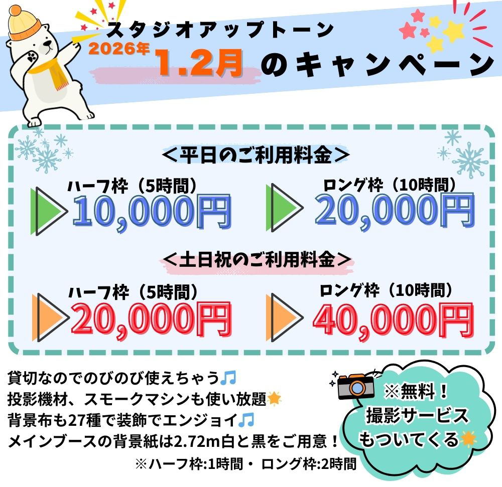 - 予約・キャンセル・お問い合わせの際は、スタジオからの返信メールが確認できない場合、メールトラブルの可能性がございます。24時間以内にスタジオからの返信がない場合は別アドレスもしくはお電話にてお問い合わせください。