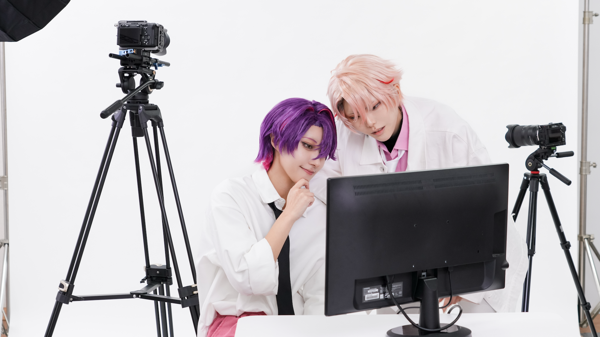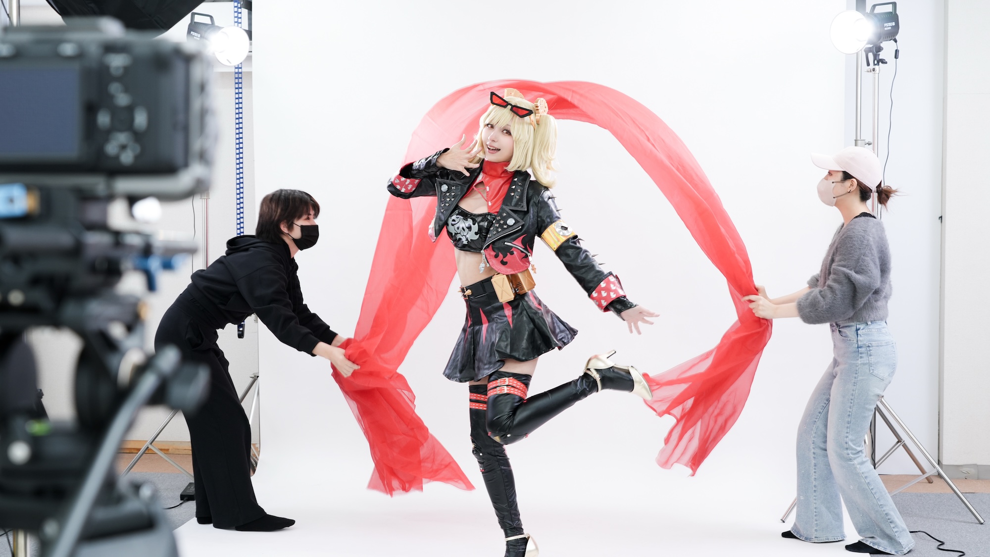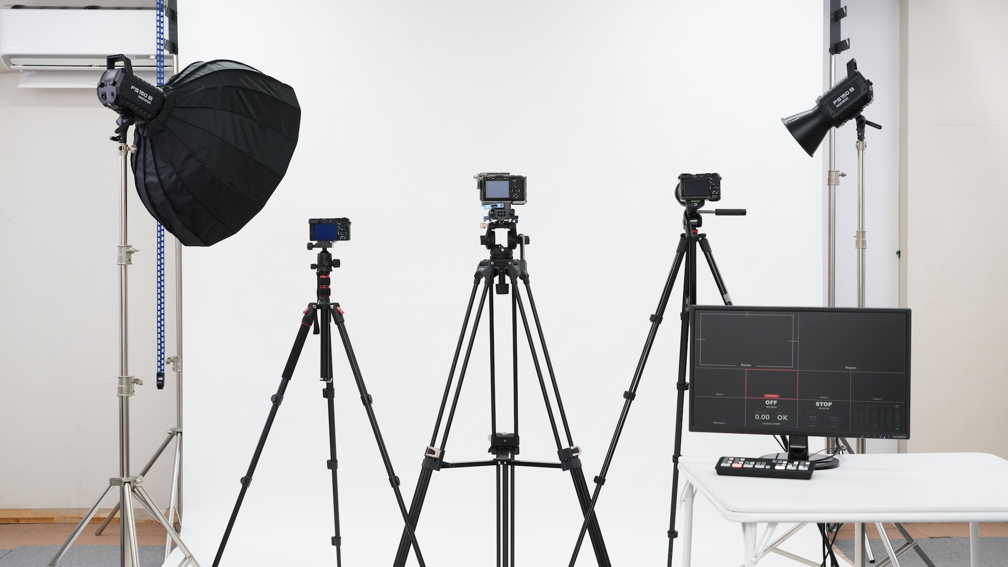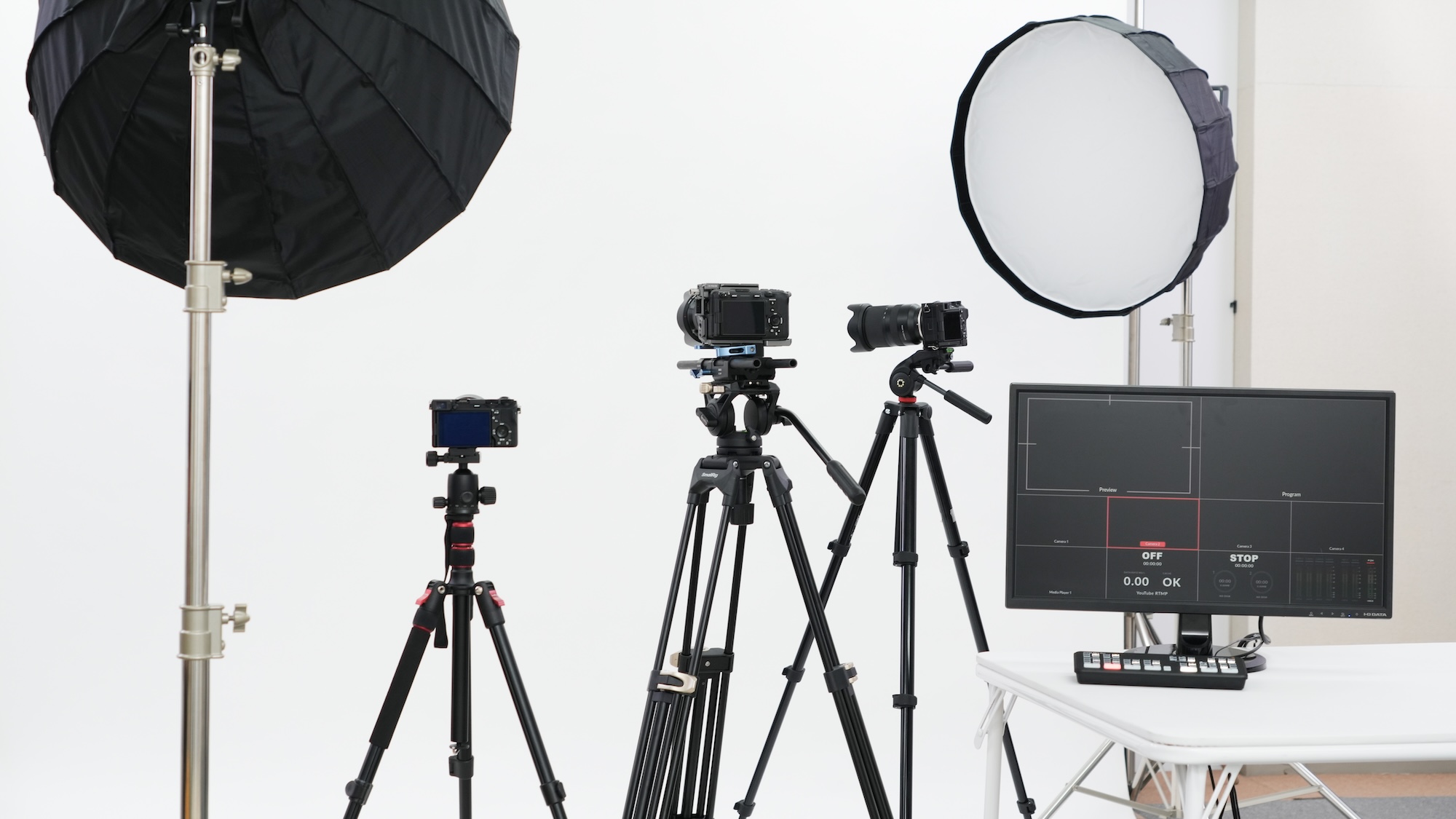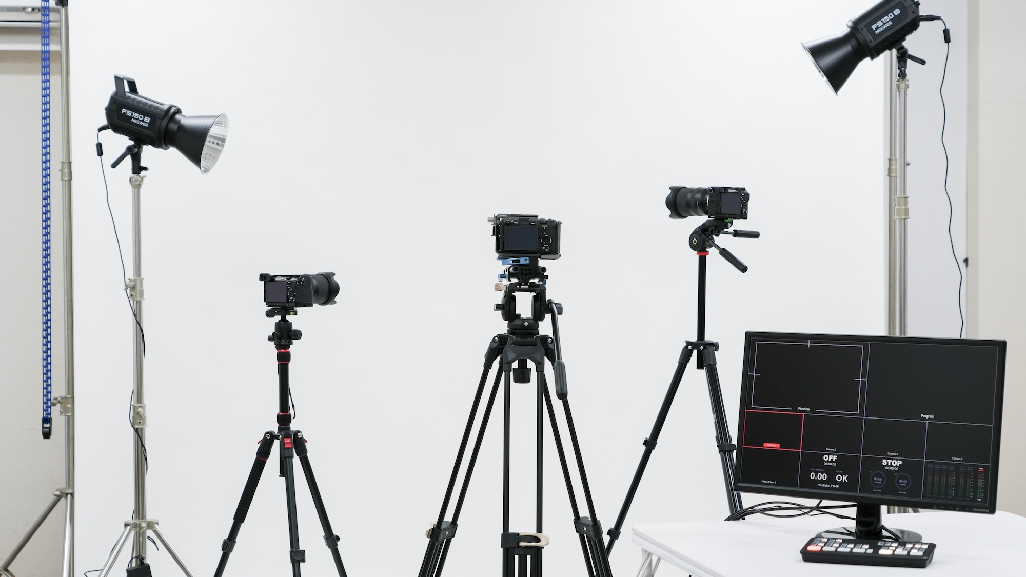 カメラ、照明、モニターなど複数の機材に囲まれて