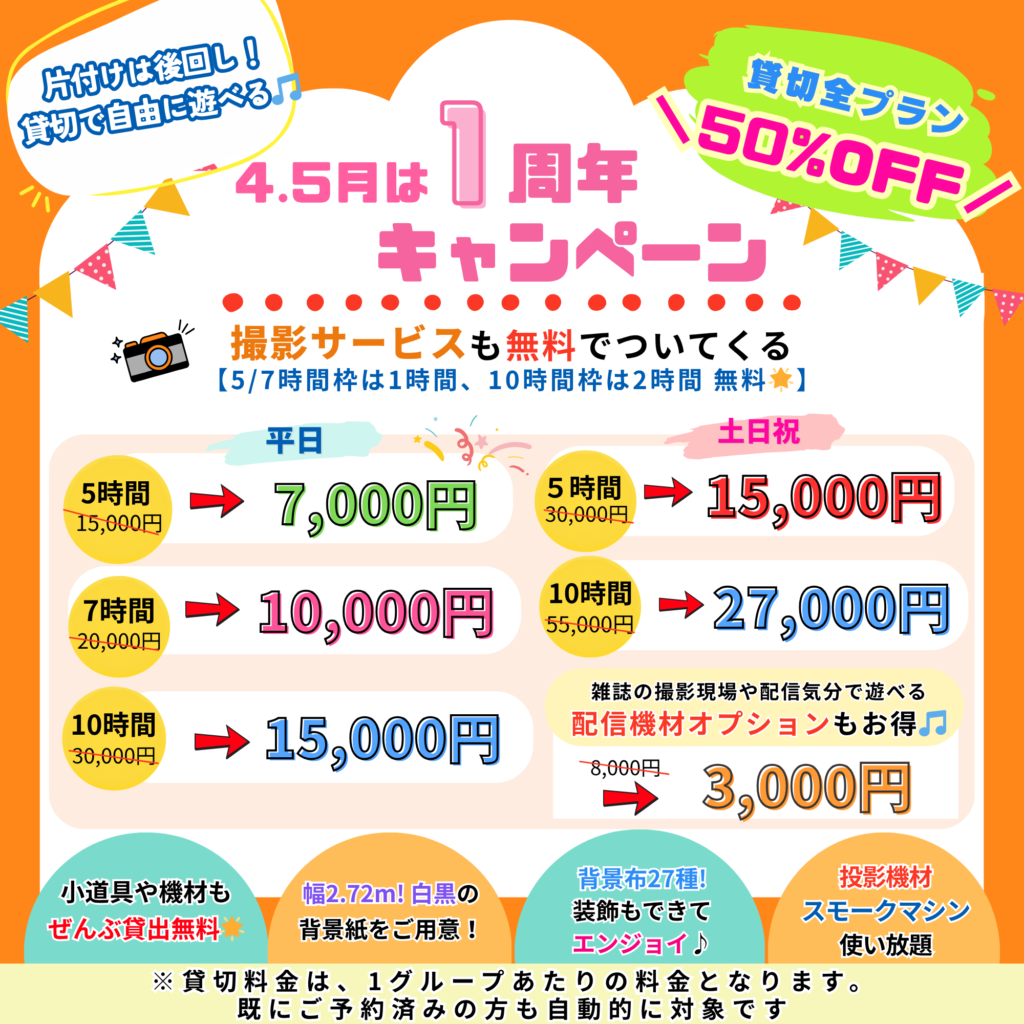 | さらに動画を 撮影したい場合は | スタジオ料金+ キャンペーン中! ➡︎¥8,000 |